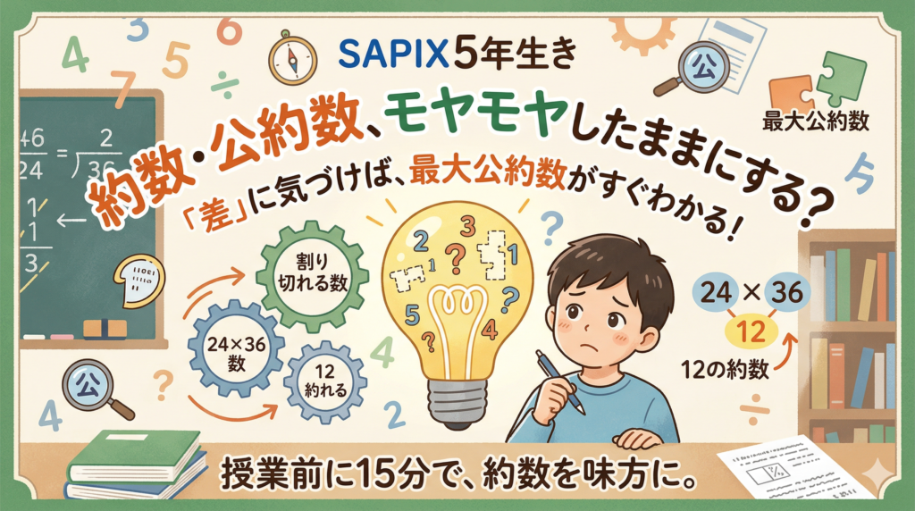 約数とは「その数を割り切れる数」です。公約数・最大公約数の意味をそろえ、差や余り・不足が出る問題で何を見ればよいか、約数の個数まで小5向けに確認します。サピックス小5算数の「15分まとめ」全体の一覧は、全体像はこちらから確認できます。