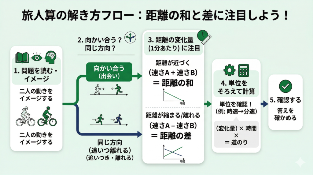 - 旅人算の基本は、「ある時間あたりどれだけ距離が変化するか」を考えること。