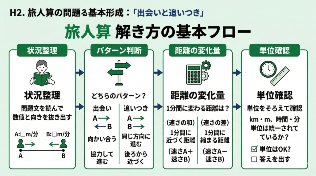 単位(秒速分速時速)をそろえ、出会いは距離の和÷速さの和、追いつきは距離の差÷速さの差で考えます。