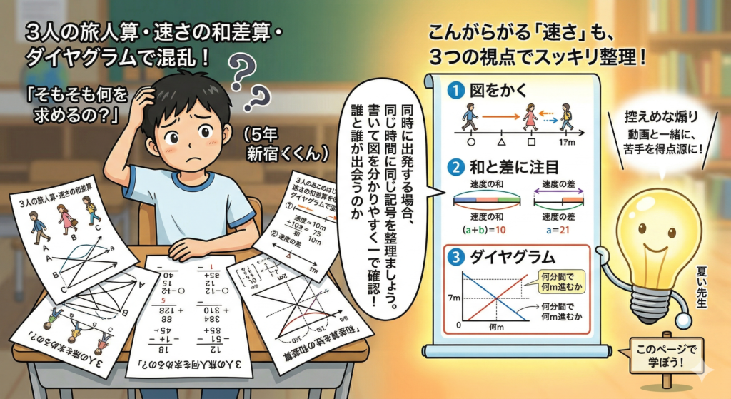 このページでは、動画とあわせて、3人の旅人算の考え方、速さの和差算の見抜き方、ダイヤグラムの読み方・使い方を整理しました。