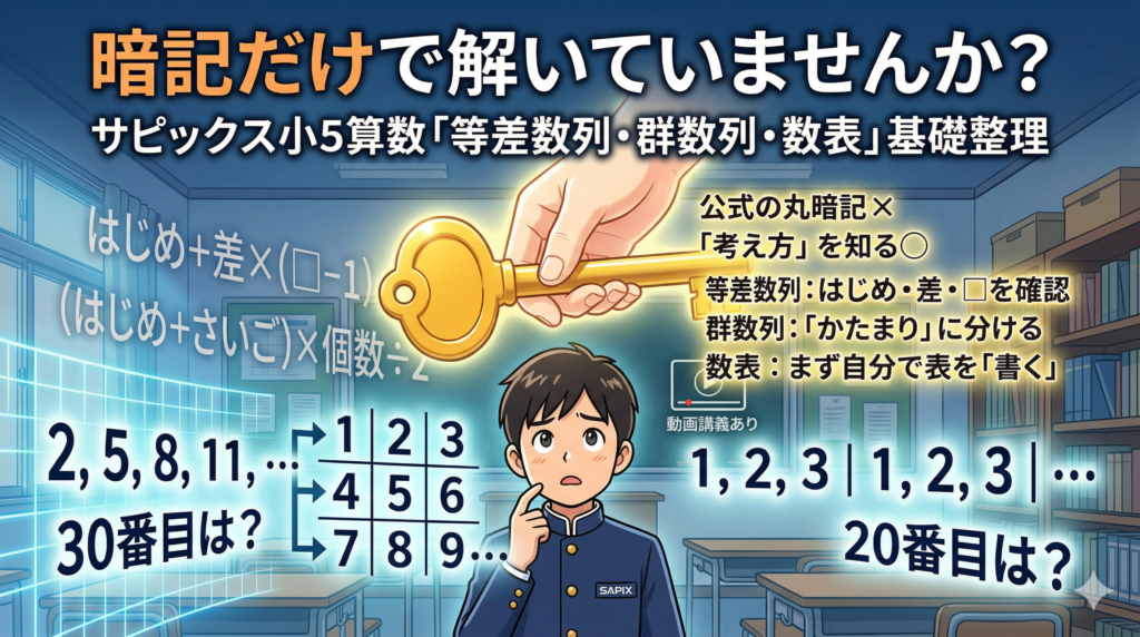 動画と本ページを併用しながら、等差数列・群数列・数表を「ただの暗記」ではなく「パターンを見抜く練習」として取り組んでいきましょう。それが、今後のサピックス算数全体の土台づくりにつながります。