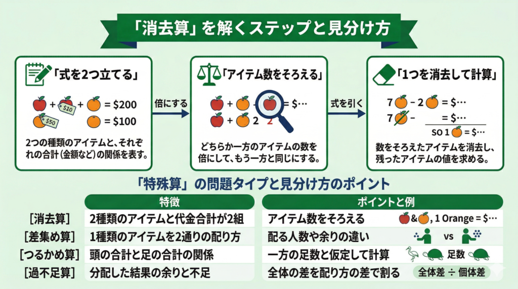 消去算は、2つのものを比べるときに、そろえやすい一方をそろえて計算する問題です。