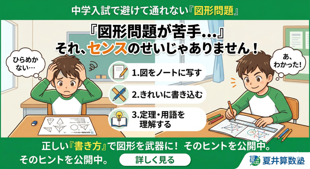 図形が苦手な小学生は、ひらめきやセンスの問題で止まっているとは限りません。実際には、図を写さない、条件を書き込めない、定理や用語を意味まで理解できていない、といった共通点が原因になっていることが多いです。このページでは、その特徴と直し方を整理します。
