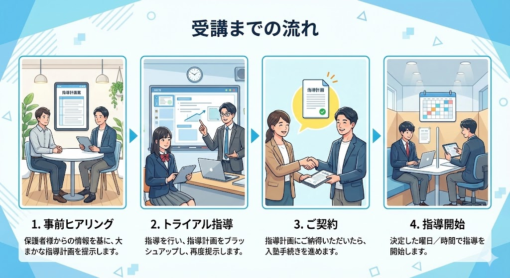 | 3. ご契約 | 指導計画にご納得いただいたら、入塾手続きを進めます。 |