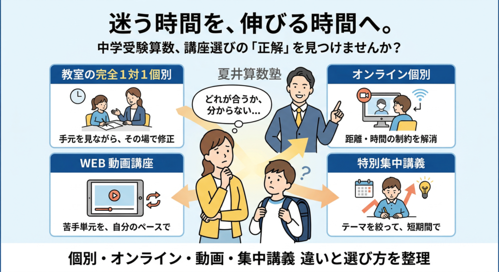 このページでは、夏井算数塾で開講している講座を、講座名の一覧より先に今の状態にどれが合いやすいかで選びやすく整理しています。